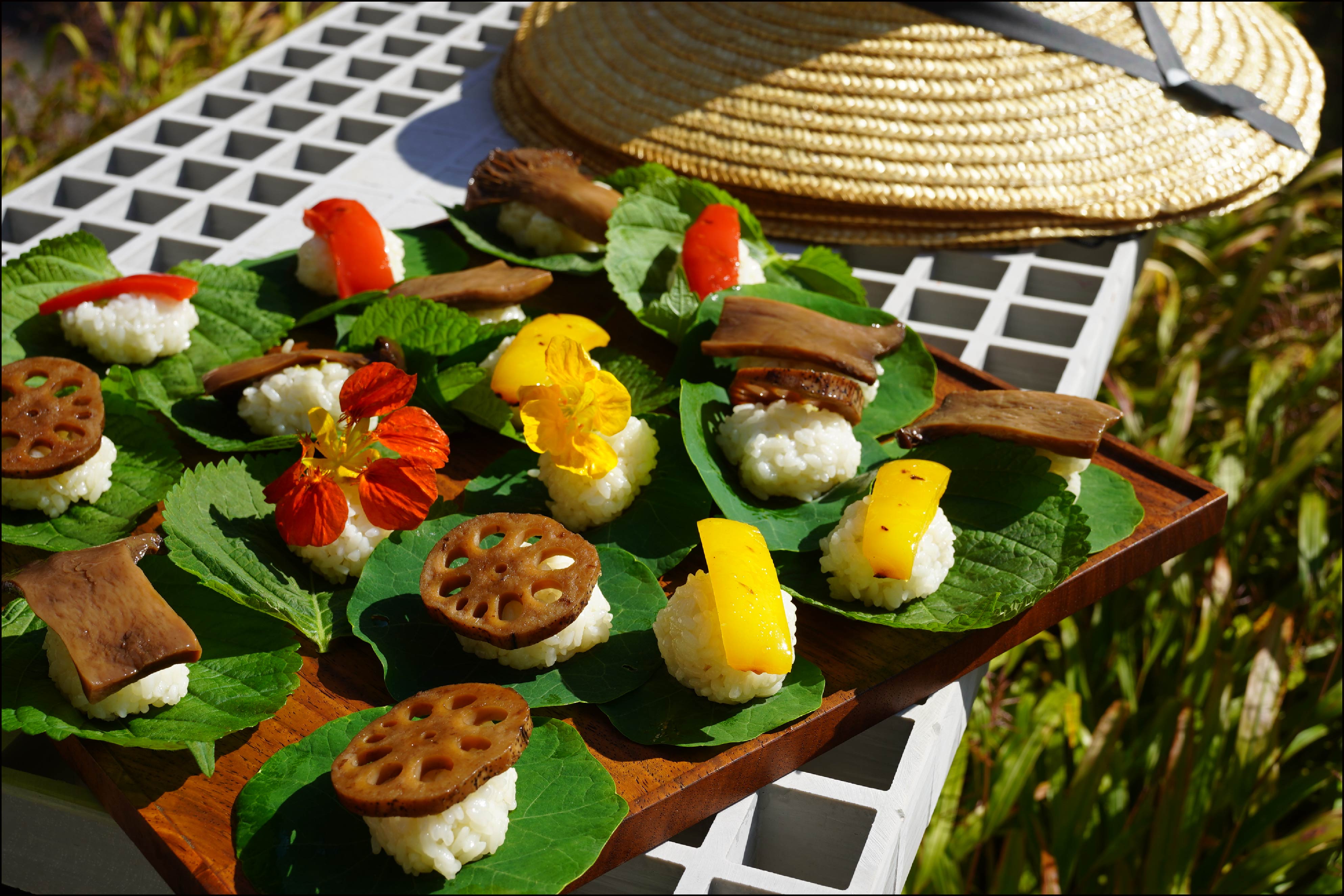 농부로부터에서 재배된 버섯, 파프리카, 연근 등의 농산물 재료로 친구들과 짝을 지은 아이들은 서로의 초밥을 만들어주었어요. 참기름 묻힌 손으로 오밀조밀 뭉친 밥을 한련화잎 위에 올리고, 친구가 좋아하는 재료들을 물어보며 기호에 따른 채소를 올려 맛도 색도 탐스런 초밥을 만들며 맛있는 식사시간을 즐겼습니다. 채소로만 이루어진 음식들도 맛있게 먹어준 친구들은 선생님들에게도 초밥을 만들어 건네며 훈훈한 감동을 주었답니다.